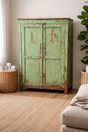 Crafted from solid wood and naturally distressed, it offers three internal shelves for practical storage while remaining a true statement piece.
