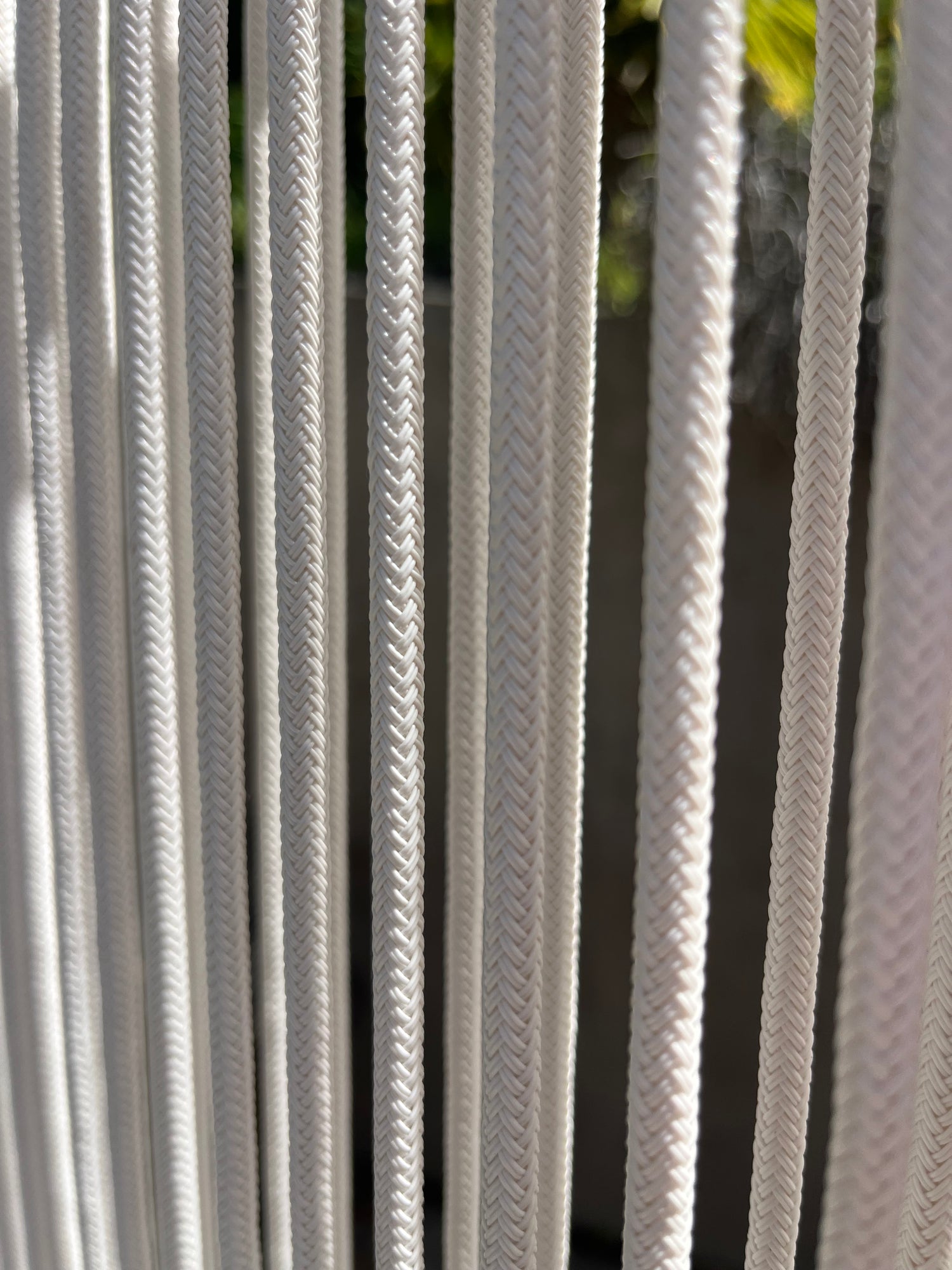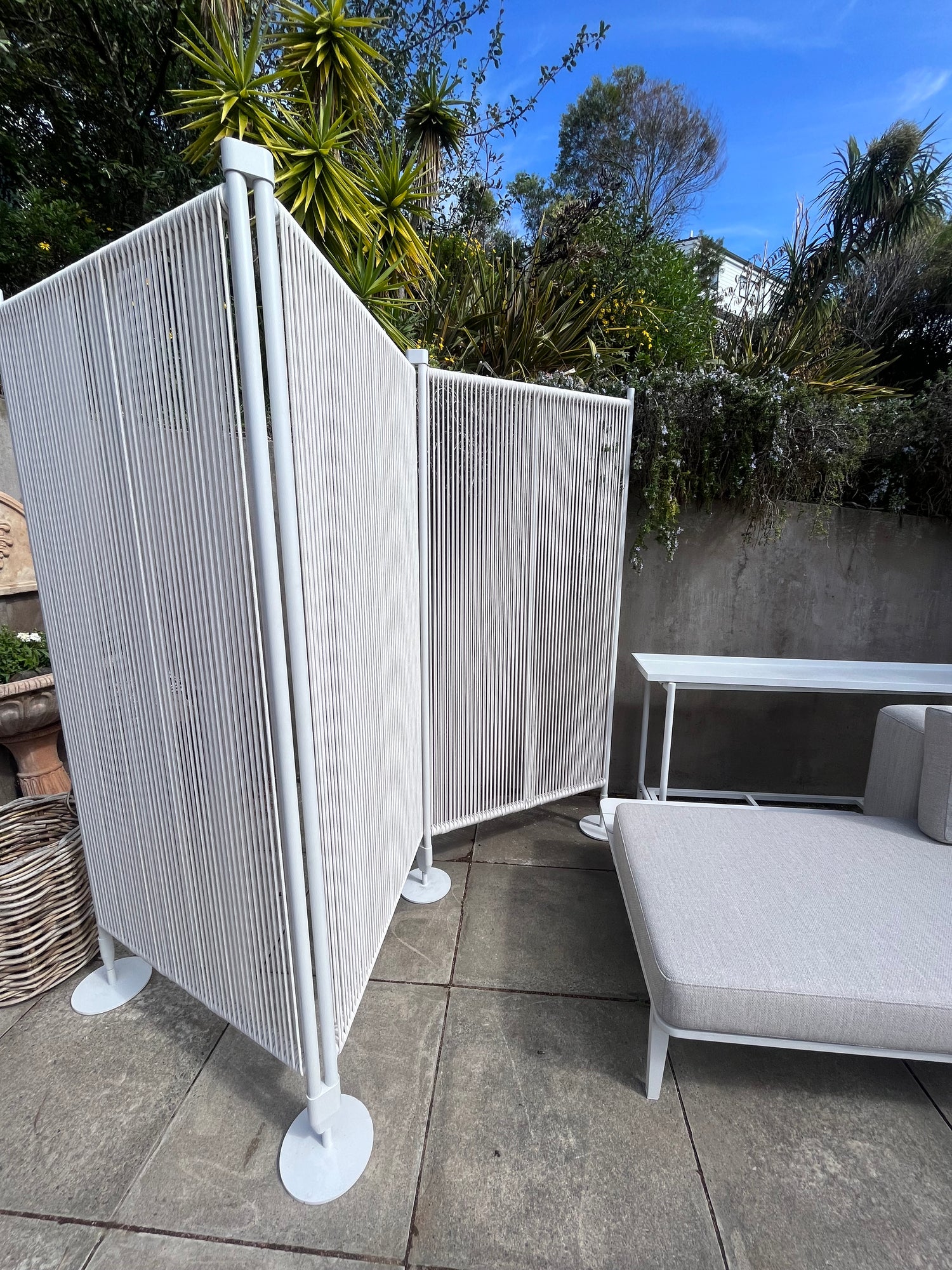 A refined and versatile dividing screen for indoors or outdoors, expertly designed with quick-dry Olefin rope and a soft white powder-coated aluminium. Sturdy, elegant, and perfect for areas such a spas, pools, garden retreats or privacy creating defined spaces.